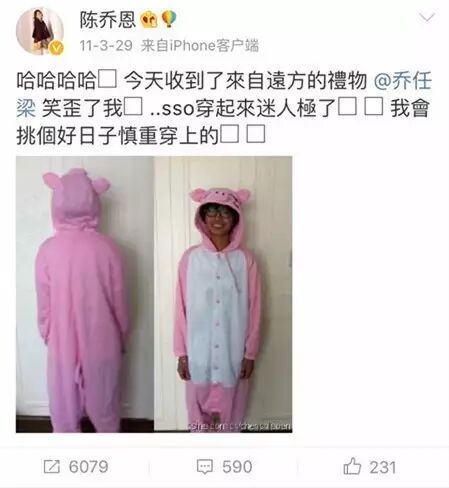 陈乔恩听到之后,就马上戴起来给大家展示看。两个人都好暖……