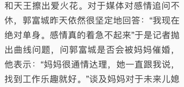 可郭富城依旧含糊其辞,对于所有事情的解释,都千篇一律,表示自己单身,感情的事情急不来。