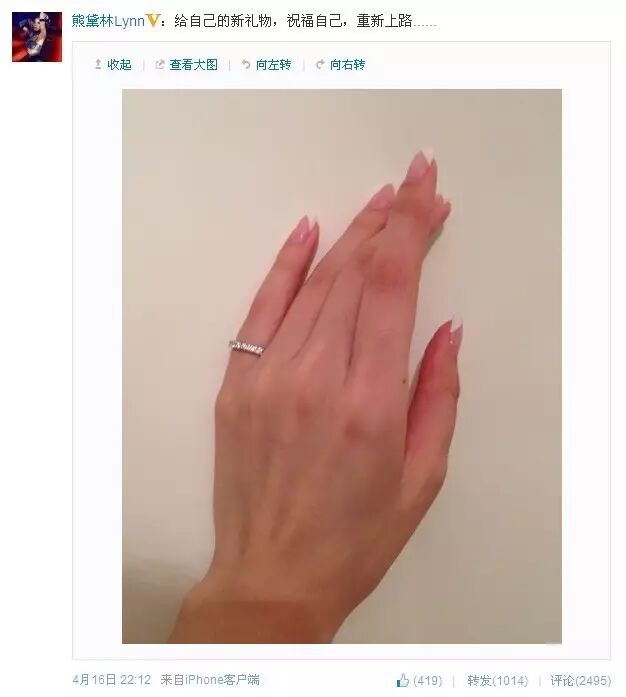 看到这一幕,所有人都以为这次他们好事真的要近了,可是过了一个月,熊黛林就在微博上晒出自己戴尾戒的照片,宣布分手,祝福自己重新上路。