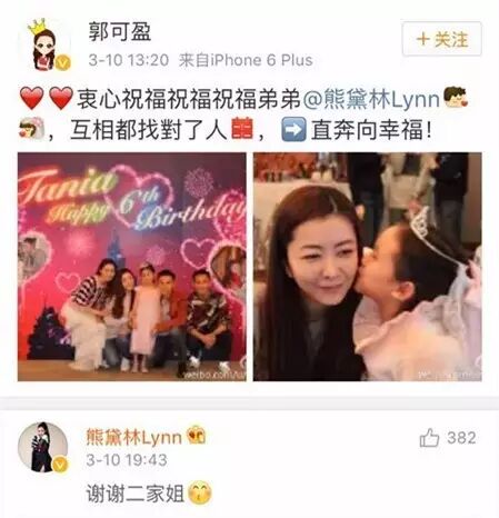 同一天郭可颂的姐姐郭可盈也发微博祝贺,熊黛林在底下评论“谢谢二家姐”,看来真的跟郭家人相处很不错哦~