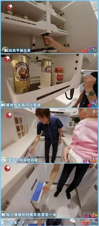 高处的东西也可以轻松地拿下来,还设计了主妇做饭累了时,可以坐下休息一会的隐藏凳。