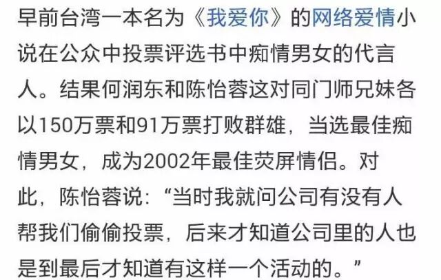 当年陈怡蓉和何润东还被公众票选为网络爱情小说书中痴情男女的代言人,成为最佳荧屏情侣
