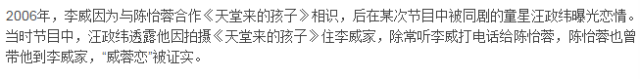 2005年在拍《天堂来的孩子》时,被剧里的童星曝光和李威交往很密。