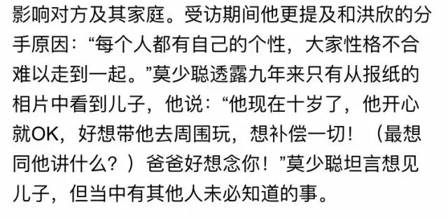 记者照例要问问生父的看法。莫少聪的回答则颇为苦涩,他表示自己已经多年没有见到儿子了,非常想念儿子,非常想补偿他。更坦言与洪欣的分手原因是因为性格不合。