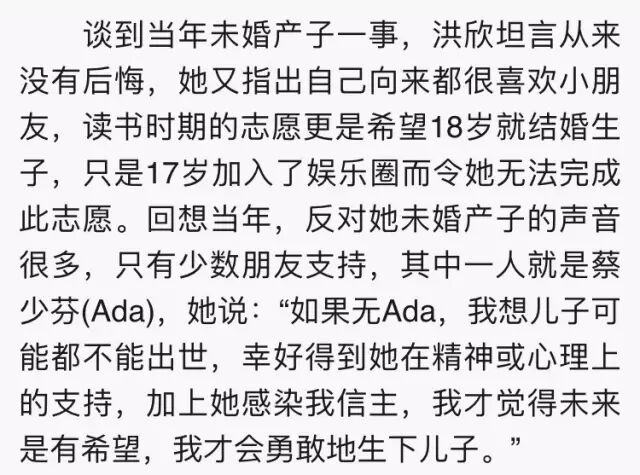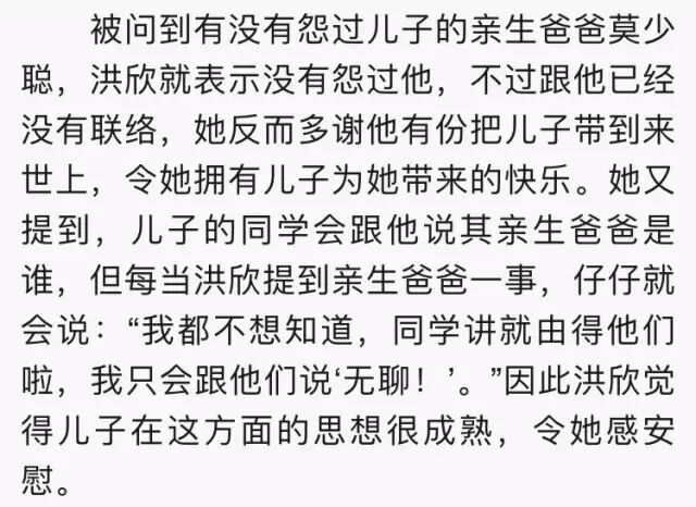 因未婚生子,洪欣形象跌入谷底。她默默抚养孩子长大,在非议中生活。有传言孩子7岁时,洪欣凭借DNA鉴定才让莫少聪哑口无言,不得不认。