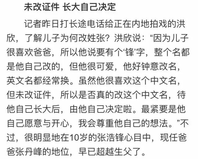 同年,10岁的儿子将自己的名字改成了张浩峰,因喜爱张丹峰故名字中也有一峰字。洪欣表示证件上的名字是否真的要改,让孩子长大自己决定