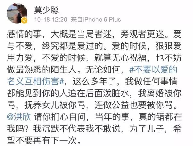 当然啦,究竟有没有互相伤害还得当事人说了算。但截止目前洪欣并未回应,在微博忙着给老公宣传新书