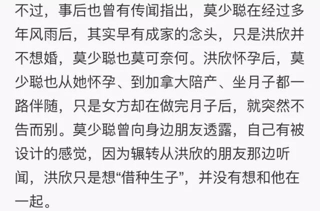 在渣男拒不认子的说法广泛流传之时,坊间还有一种说法,称洪欣怀孕后,莫少聪其实已有与其共组家庭的念头,只是洪欣不想婚,在做完月子后洪欣突然不告而别。女方似乎只想借种生子,让莫少聪觉得自己被设计。但这种说法似乎与莫少聪直到儿子7岁才承认其身份的事实对不上。