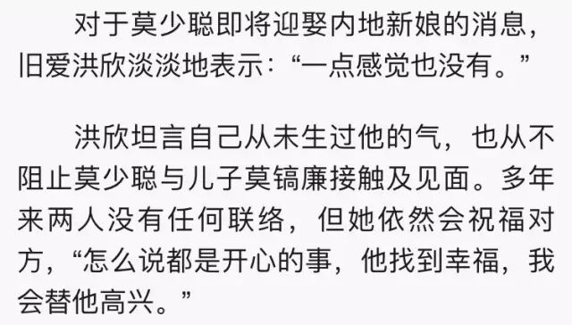 莫少聪这边厢刚一承认,记者就立即向洪欣询问看法。她说多年来与莫少聪没有任何联络,但仍祝福对方