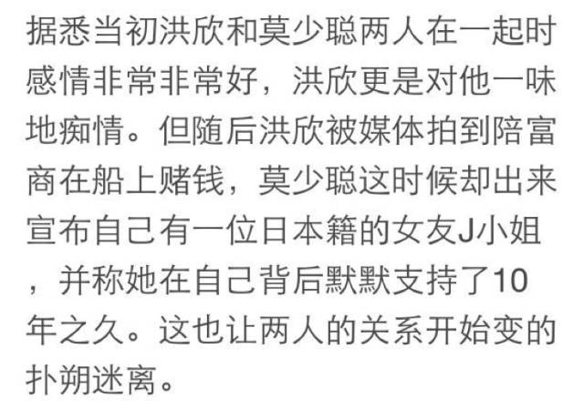 几年后洪欣怀孕,按道理本该甜甜蜜蜜去领证才对,谁知莫少聪却表示自己一直忙于工作,根本没机会谈情说爱,直接否认与洪欣的情侣关系,也拒绝承认自己是孩子父亲