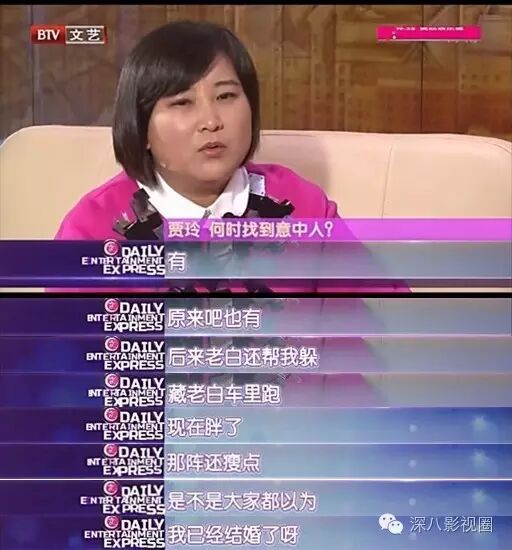 做访谈时主持问她介不介意谈感情,她嘻嘻哈哈地说不介意但没啥可说的。主持问:示爱的有没有呢?她说瘦点的时候还有,长胖之后没人示爱了,是不是误以为自己结婚了呀。