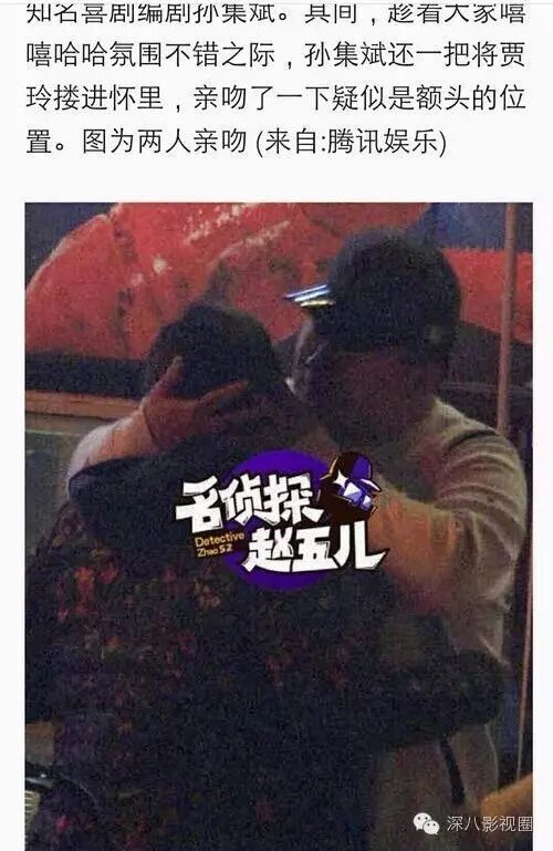 不过光是上面那张照片好像不够实锤,亲吻额头也可以解释为友情吧,而且贾玲孙集斌被拍时还有好些同事朋友在一起呢。为了确认清楚,深八君又去看了赵五儿的视频,原来狗仔跟拍了他们36小时,在几个不同的场合都拍到他们好像在亲!