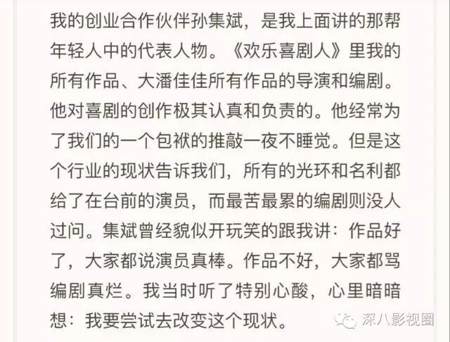 在宣布创业的长微博里,贾玲有特意为孙集斌而写的一段话。她说:所有光环和名利都给了在台前的演员,而最苦最累的编剧则没人过问,她想要尝试改变这个现状。