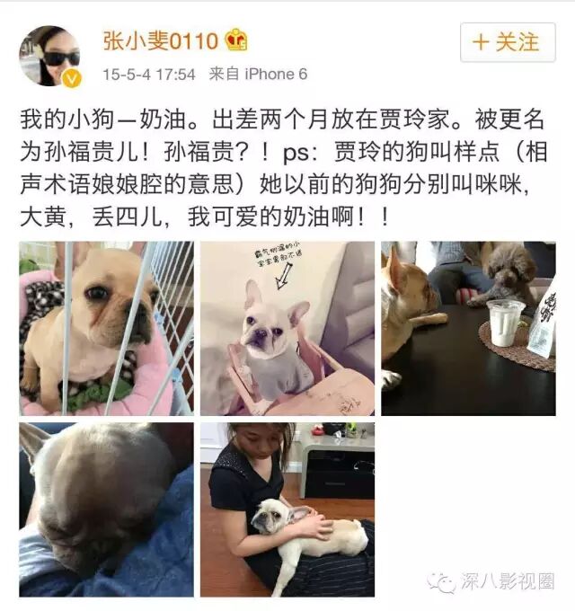 其实这原本是贾玲闺蜜兼旗下艺人张小斐的狗狗,她出差两个月寄放在贾玲家,从此被贾玲霸占,还把狗名从奶油改成了孙富贵。这名字跟贾玲原先的狗狗名都不是一个系列的。