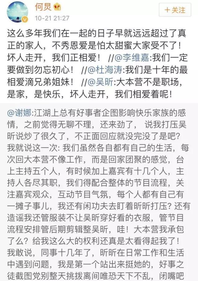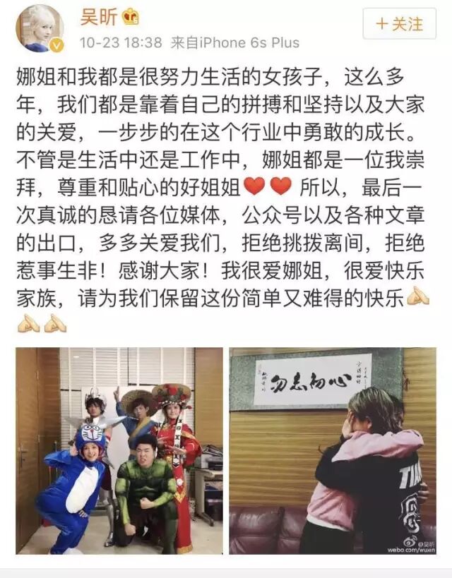 最后吴昕发了条快乐家族抱在一起,“勿忘初心”的微博,算是结束了此事。