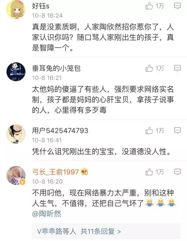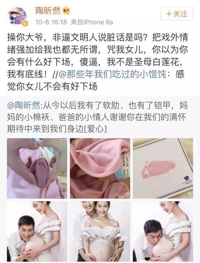 最近,艺人陶昕然就因为网友言语不当伤害了她的孩子而爆粗口回骂网友,