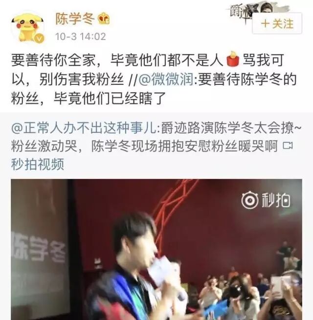 闹得最大的就属陈学冬了吧,有人骂他粉丝,他说,“骂我可以,别伤害粉丝”,还给这位网友点了根蜡,