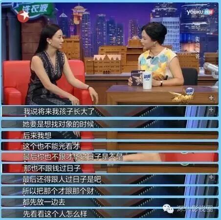 她是这么说的:“不能光看才,最后你也不跟才华过日子,那也不跟钱过日子,所以把才和财都放一边去,先看看这个人怎么样”。