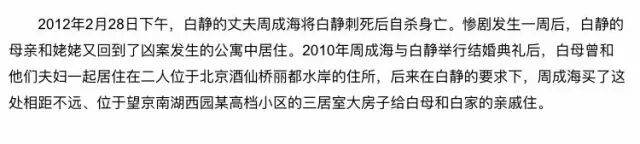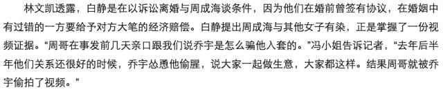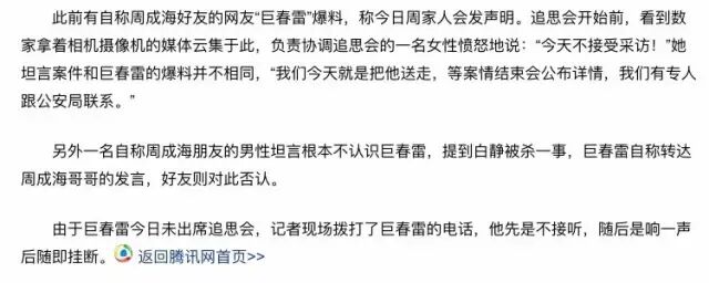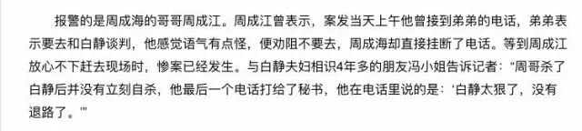 好友冯小姐爆料,周死前的最后一通电话打给了秘书,他说:“白静太狠了,没有退路了”。