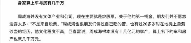 白静一直以为周身价上亿,但据周的朋友巨春雷爆料周家产只有大约几千万,没有实体公司,收入大多来源于股票。究竟是靠什么发家的,朋友们都讳莫如深,谁也不肯说出来。