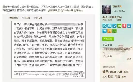 而在白静死讯公布后,巨春雷再发微博称乔宇与白静有不正当关系