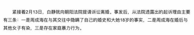 2012年2月13日,白静向法院提请诉讼离婚,理由有三点:一是周成海在与其交往中隐瞒了自己的婚史和大她18岁的事实,二是周成海在婚后与其他女子有染,三是存在家庭暴力行为。