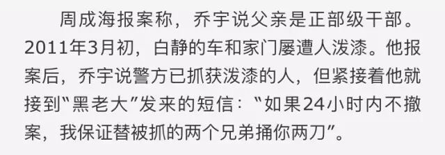 没多久,白静的车和家门也相继被泼油漆。报案后,乔宇称泼油漆的人已被警方抓获。紧接着周就接到“黑社会老大”发来的短信:“如果24小时内不撤案,我保证替被抓的两个兄弟捅你两刀”。