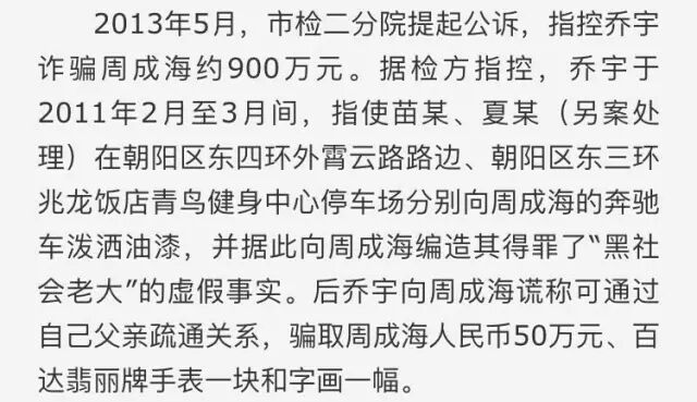 在惨案发生的前几天,周成海以遭遇诈骗为由向朝阳警方报案,称自己被乔宇诈骗,警方以涉嫌诈骗罪将乔宇抓获。2015年乔宇诈骗案一审宣判,法院认定乔宇诈骗236万元,一审以诈骗罪判处其有期徒刑11年。