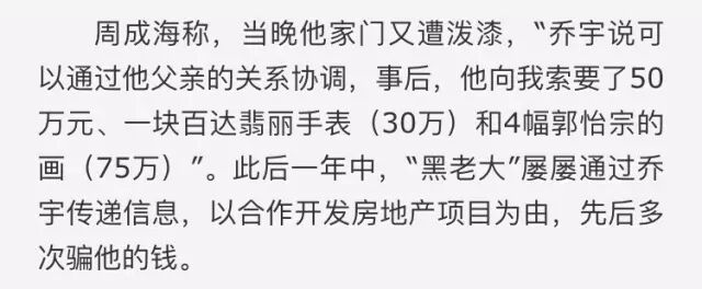 2011年周成海和白静的车子、家门多次被泼漆,周怀疑自己得罪了道上的人。于是拜托乔宇帮忙疏通。