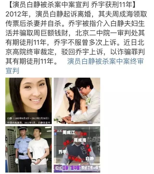 今天,演员白静被杀案中案终审宣判了。
