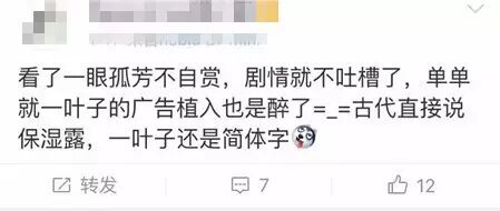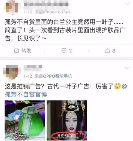其实不止孤芳剧组,八八看了下近几年热播的古装剧,里面的广告植入真是让人哭笑不得,看到广告后每一部古装剧都分分钟穿越成现代剧。