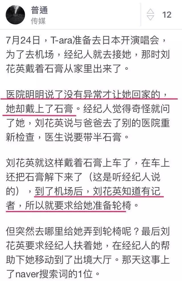 然而有一位自称是前T-ara的工作人员爆料,刘花英的腿扭伤以后就已送至首尔拍X光,确认无大碍以后出院,后来在前往日本开演唱会的路上却自己戴上了石膏。(以下是翻译过后的版本)