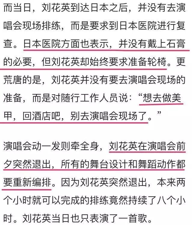 之后还有爆料说,到了日本以后,日本医院也表示她的腿没事。她却不想去演唱会而想去美甲,后来导致演唱会所有舞蹈需要重新编排。后来刘花英只在演唱会现场唱了《day by day》这一首歌。