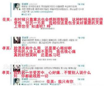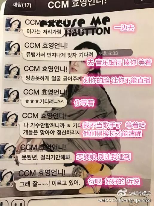 这位工作人员曝出了一段聊天记录,是刘花英的姐姐刘孝英在录《音乐银行》之前给T-ara最小成员李雅琳发的威胁短信:信不信我刮花你的脸?反正言语间就是一副社会你花姐的样子