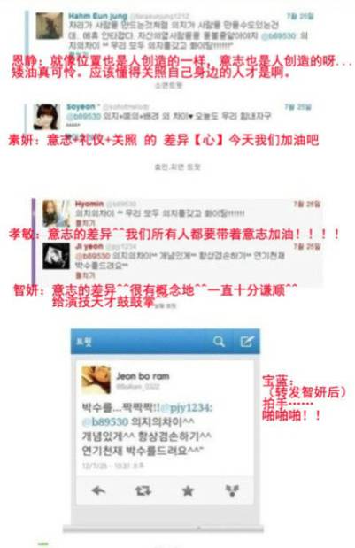 辛辛苦苦排练了那么久,现在又让重新排,这不就是传说中的猪队友?也许是带伤上阵惯了,7月25日,T-ara成员都在推特上po文说:“意志的差异”之类关于”意志”的讨论,韩国网民都觉得这是在影射刘花英。