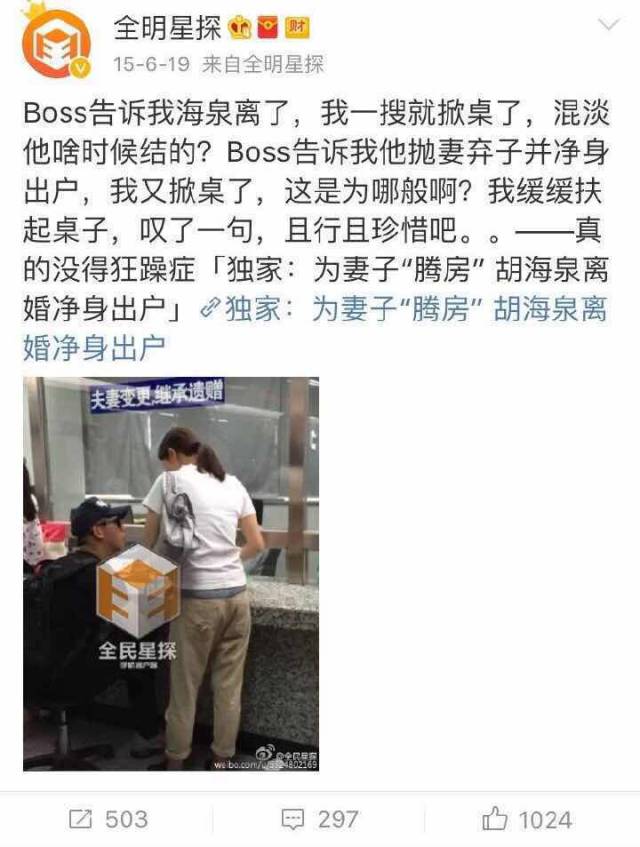 这边刚否认完没过几个月,全明星探又曝出胡海泉办财产转移手续,疑似离婚净身出户。所以疑似离婚也是你说,出轨也是你说....