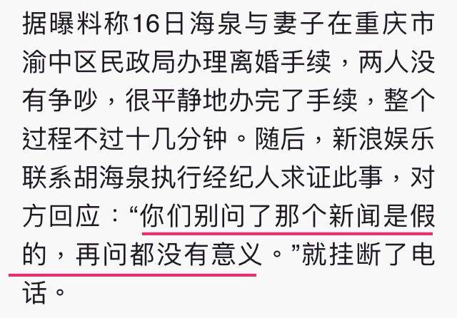 这个消息还没等到本人证实,15年3月,就有人曝出在重庆市渝中区民政局看到胡海泉办理离婚手续,然而这个消息被经纪人否认了,说是假新闻。