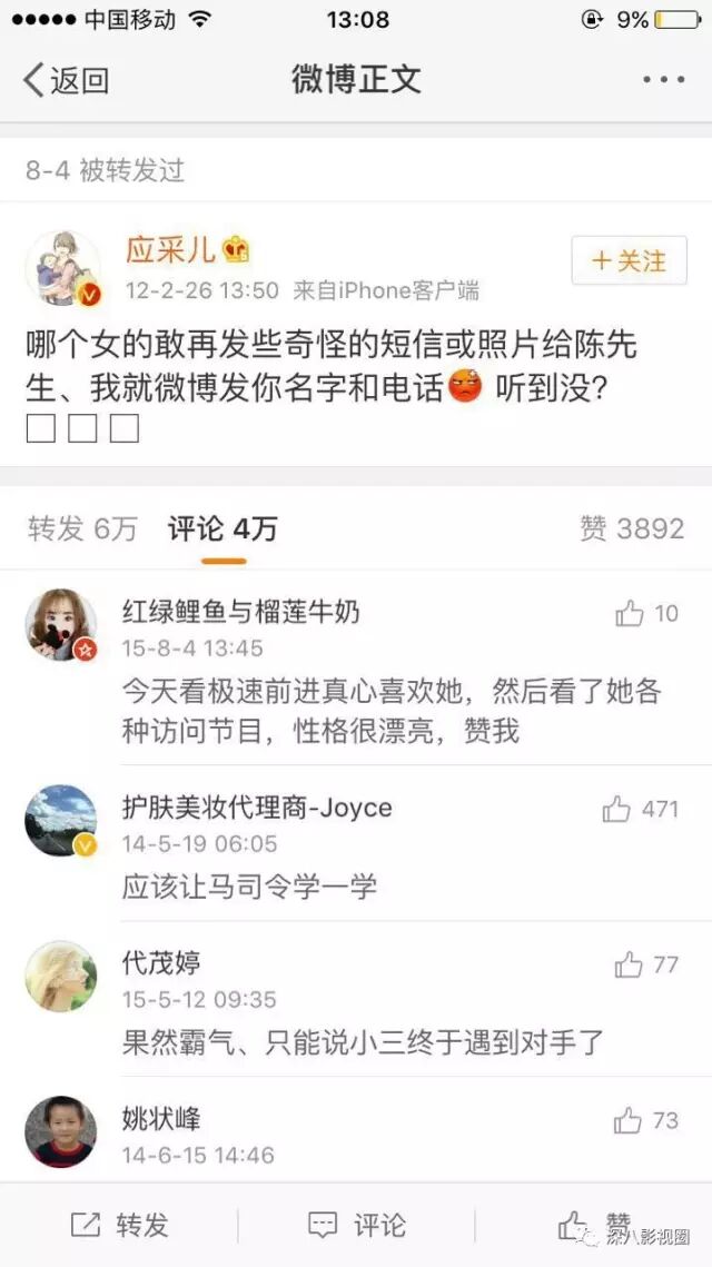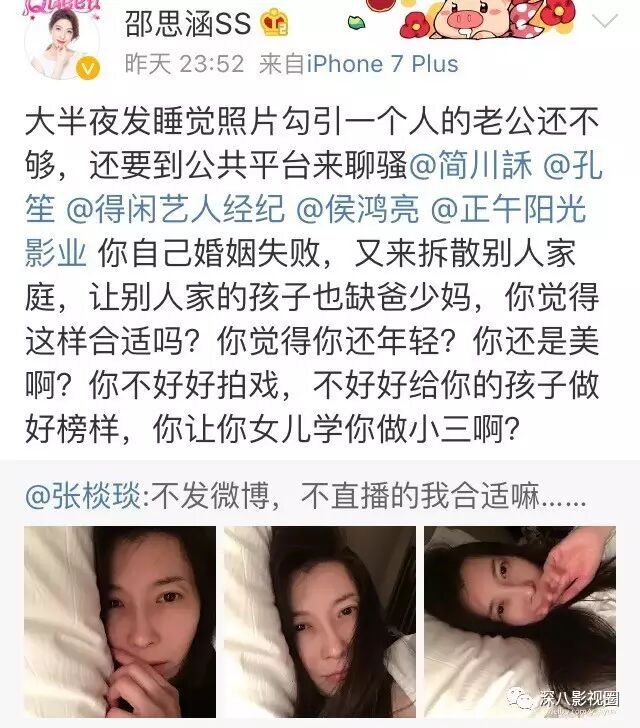 昨天深夜没睡的八卦群众,午夜前兴奋了一把。好久没见明星正主儿下场撕逼了,而且是正中大众G点的出轨小三话题!指名道姓“撕小三”的正宫连续发了几条含义差不多的微博,八八懒得一一贴上来,各位看这条就差不多了。