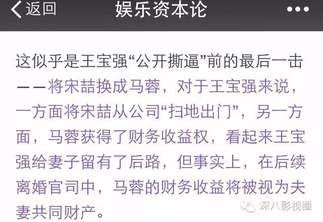 从娱乐资本论的专业分析来看,通过股权变更,王宝强一方面将宋喆扫地出门,另一方面马蓉的财务收益将被视为夫妻共同财产,这样就以巧妙手法最大程度保障了自己的权益。