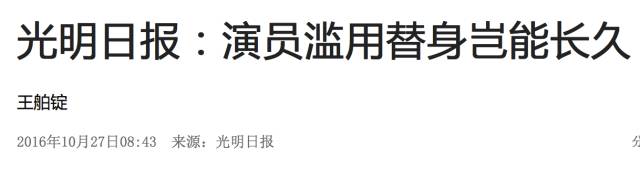 “替身”之所以变成了负面词汇,还是部分新生代艺人给外界留下了不敬业的印象导致的。这些演员参演的影视剧,质量每况愈下,难以服众,因此频用“替身”不再是情有可原。