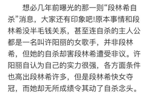 当时一度传出过段林希自杀的消息,事实上只是当时有一个人不满意段林希获得冠军所以选择自杀。也有被雪藏的传闻,但都是不足为信。