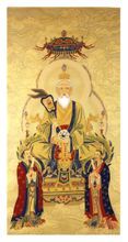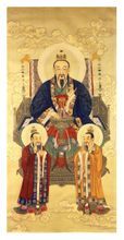 一般道教宫观内都供奉“三清”塑像,称为三清殿或三清宫。元始天尊是道教最高神灵"三清"尊神之一,他左手虚拈,右手虚捧,象征着世界的原始状态,是道教开天辟地之神,称玉清元始天尊,也称元始天王,为上古盘古氏尊谓。元始天尊在"三清"之中位为最尊,也是道教神仙中的第一位尊神。灵宝天尊原称上清高圣太上玉晨元皇大道君,手中捧着一个阴阳镜,象征着世界刚刚走出混沌时的状态,列其在第二神阶之中位。道德天尊即太上老君,手里拿着一把画有阴阳镜的扇子,象征着世界被创造最初的状态,居"三清尊神"的第三位。