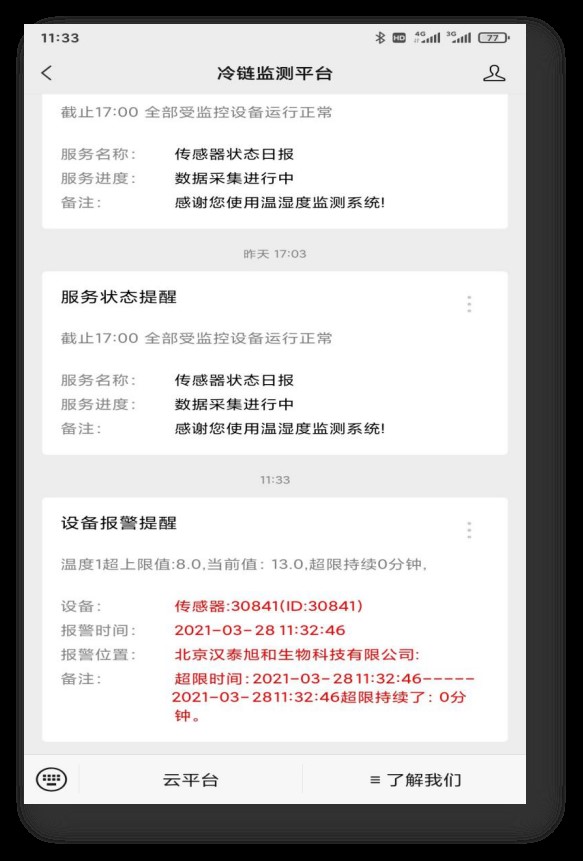 超限报警:当数据异常时,系统通过微信、短信等方式向指定人员发送报警信息。