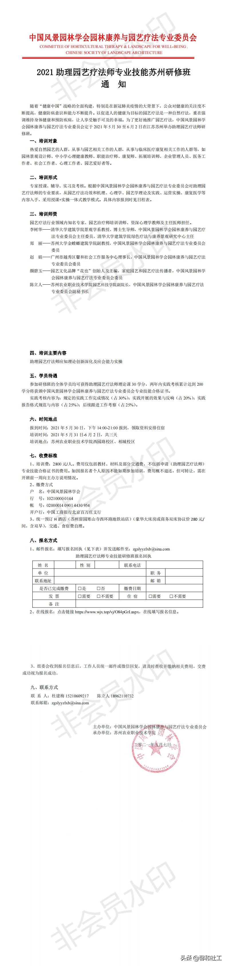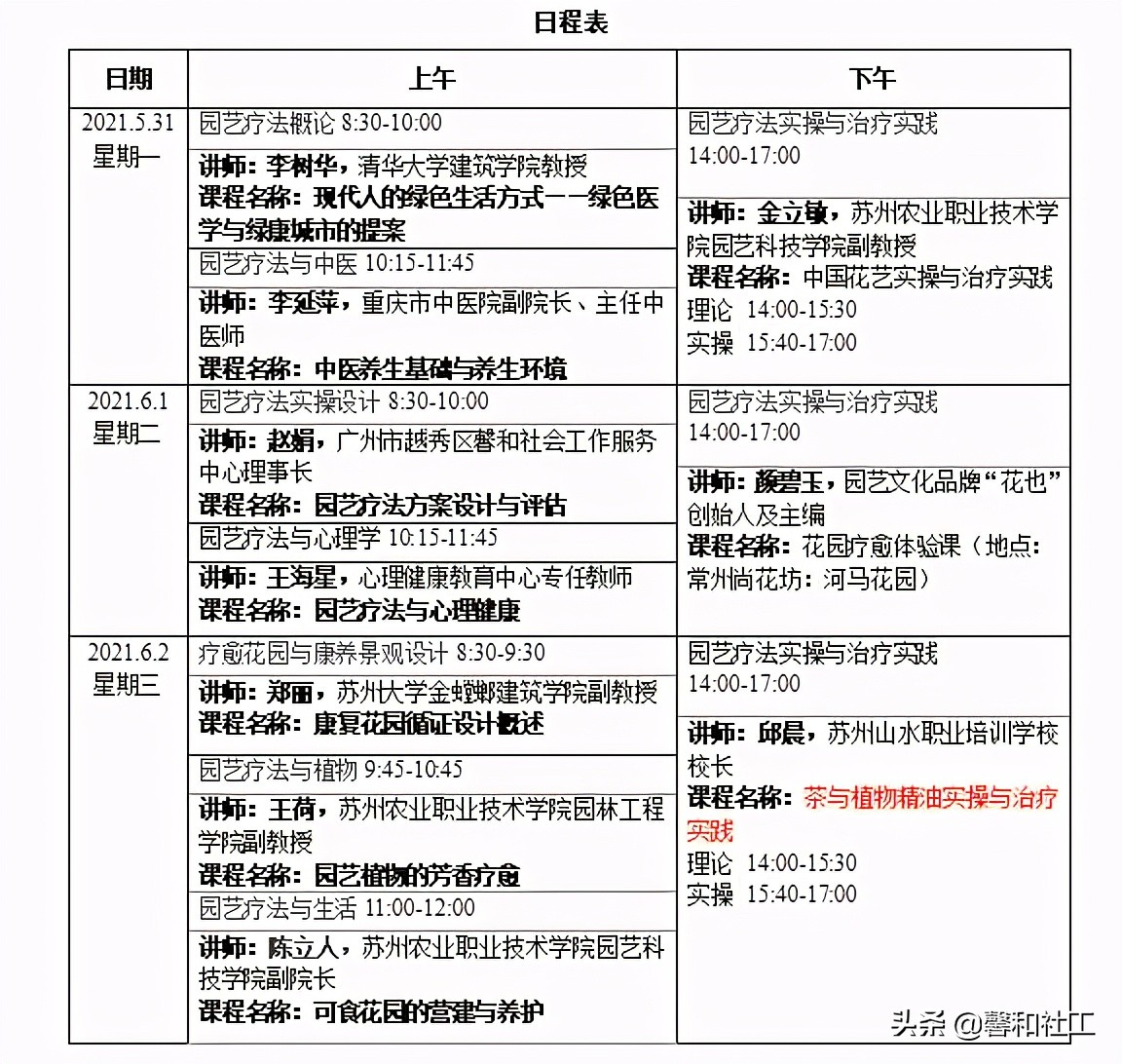 专家授课、辅导、实习及考核。根据中国风景园林学会园林康养与园艺疗法专业委员会对助理园艺疗法师的专业要求,从园艺疗法功效和机理、心理学、园艺学理论及实践、运营实操、康复医学等内容入手,采用授课+实操一体式教学模式。具体内容报到时间日程表。