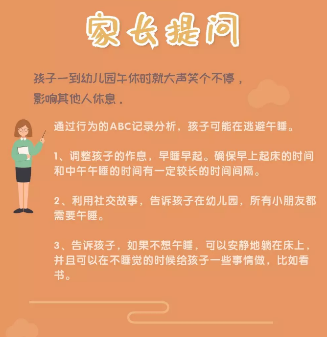 笑个不停,影响其他人体息,北大医疗脑健康儿童发展中心的专家通过行为的ABC记录分析,孩子可能在逃避午睡。