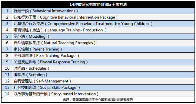 (图为:美国国家自闭症中心报告中被证实的14种干预方法)