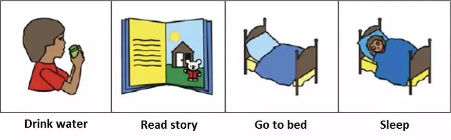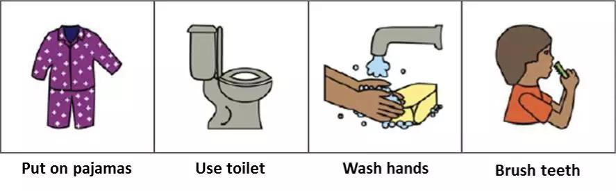 在睡觉前的15到30分钟前开始活动日程对于年龄小的一岁左右的儿童可以从15分钟开始,随着年龄的增大,时间可以增长。但整个的活动日程不能超过一个小时。活动日程表范例和视觉提示