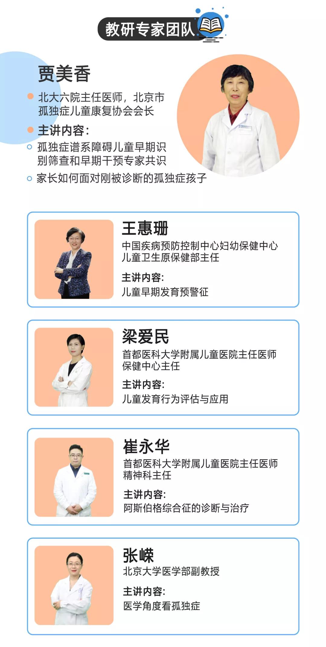 就在她急切需要系统化知识帮助的时候,她在经常浏览的“北医脑健康行为发展教研院”公众号上看到了免费公益培训《孤独症康复专业先修课》的报名通知,在那份长长的课程介绍里,她看到了北京大学第六医院的贾美香主任,也看到了北京大学医学部的张嵘副教授,还有国内少有的国际认证行为分析师、助理行为分析师等等,如此一流的专家团队,而且还免费,她第一时间就报了名。
