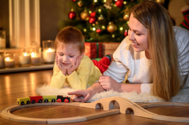 费费看着礼物委屈地说:“我不想把礼物送给它。”我赶紧给妈妈一个眼神,妈妈说:“那你把礼物送给我,我再给松树好么?”费费赶紧把手里的玩意儿给了妈妈,妈妈自己把它挂到了松树上,对费费说:“哇,好漂亮啊,费费要不要来 试一下?”费费蠢蠢欲动,但是还是没有勇气去挂。我又拿了一个小礼物,示范挂到了上面,妈妈和我都鼓励费费加油。这个时候费费已经犹豫地拿出了一个圣诞老人,迟疑地往前走去,边走边停,最后轻轻地挂在了松树上面,我和妈妈都欢呼雀跃地夸奖她:“费费好棒啊,给松树送礼物啦,松树要谢谢你啦。”