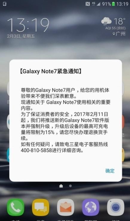 三星公司为了召回,已经更新过一个控制充电的版本,限制充电量,并且还限制上网,使用三星Note7的用户无法使用这款手机正常的访问网络,除了这些硬性办法之外,三星也对上缴三星Note7的用户提供了不少的福利,例如高折扣抵换其他的三星手机,还有全额退款等,而近日国行版三星Note7的用户收到了一则通知,这是一则强制升级的措施,将充电电量限制到了15%,基本已经处于关机状态。